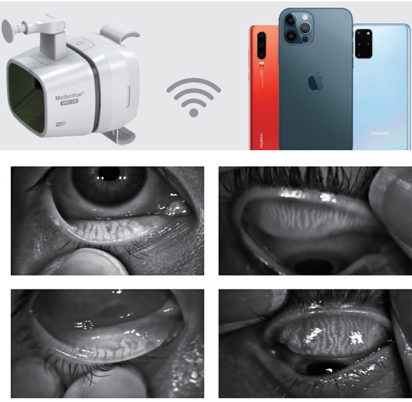 MeiboVue® applies high tech Wi-Fi technology to transfer live video stream with smartphone app wirelessly. User can preview and capture meibomian glands images on VisuDocTM app easily.