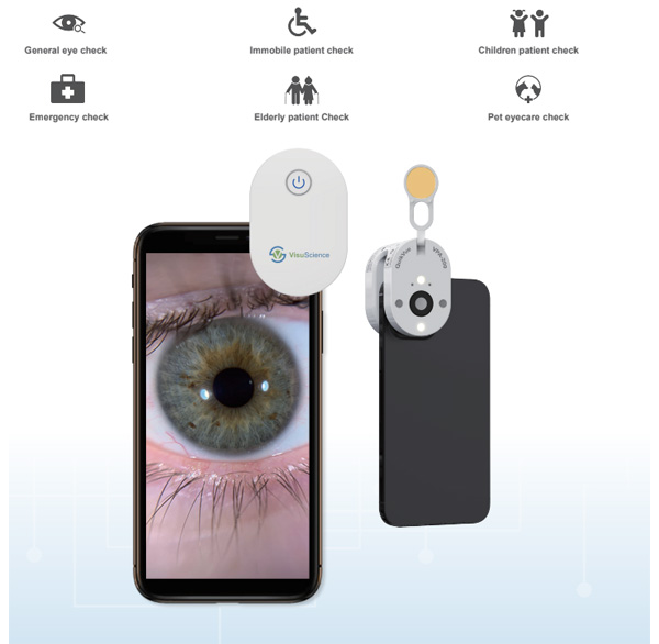 QuikVue Plus is compatible with the smartphone's default camera app, as well as the VisuDoc ophthalmic case management app developed by VisuScience. VisuDoc is available for download on both the App Store and Google Play.